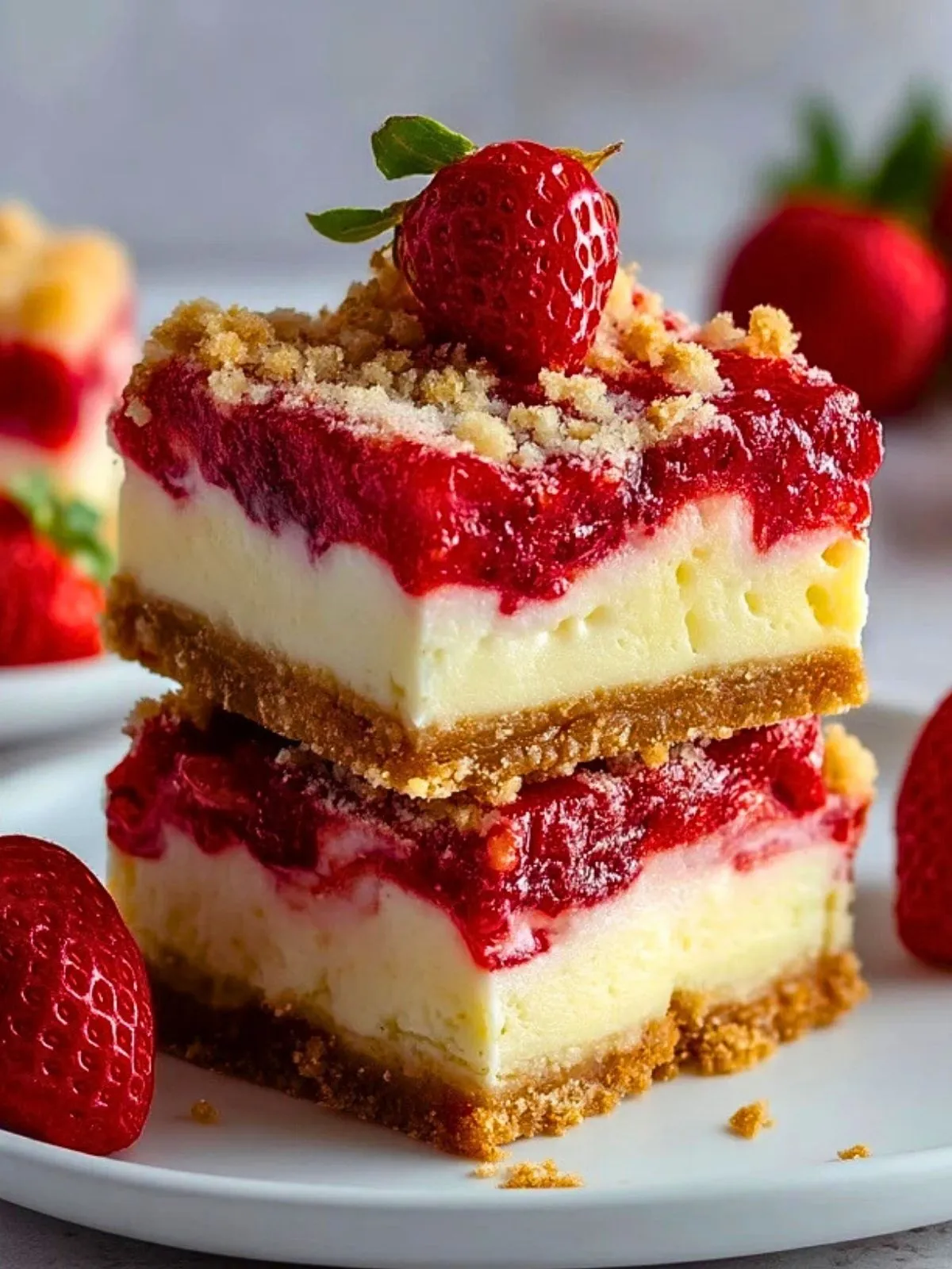 Ces Barres De Cheesecake Aux Fraises Célestes combinent une base biscuitée croustillante, un cheesecake ultra crémeux et une généreuse couche de fraises brillantes façon miroir. Faciles à découper et à transporter, elles sont parfaites pour les desserts de fête, les buffets et les pique-niques, tout en offrant la gourmandise d’un vrai cheesecake aux fraises maison.