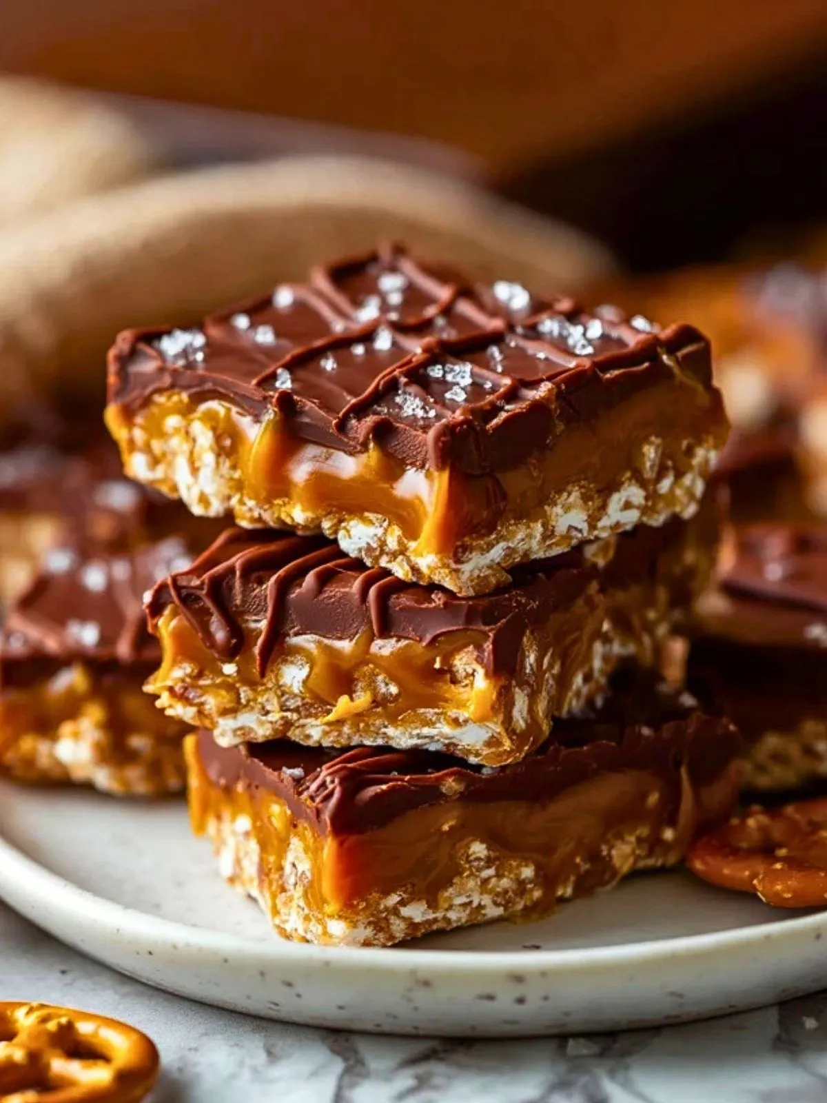 Ce que j’adore avec ces barres, c’est le mélange parfait des textures et des saveurs : le sucré du caramel, le chocolat intense, le croquant salé des bretzels et la touche de fleur de sel qui réveille le tout. Je les prépare souvent à l’avance pour un goûter, un anniversaire ou pour compléter un buffet de desserts, et il n’en reste jamais une miette.