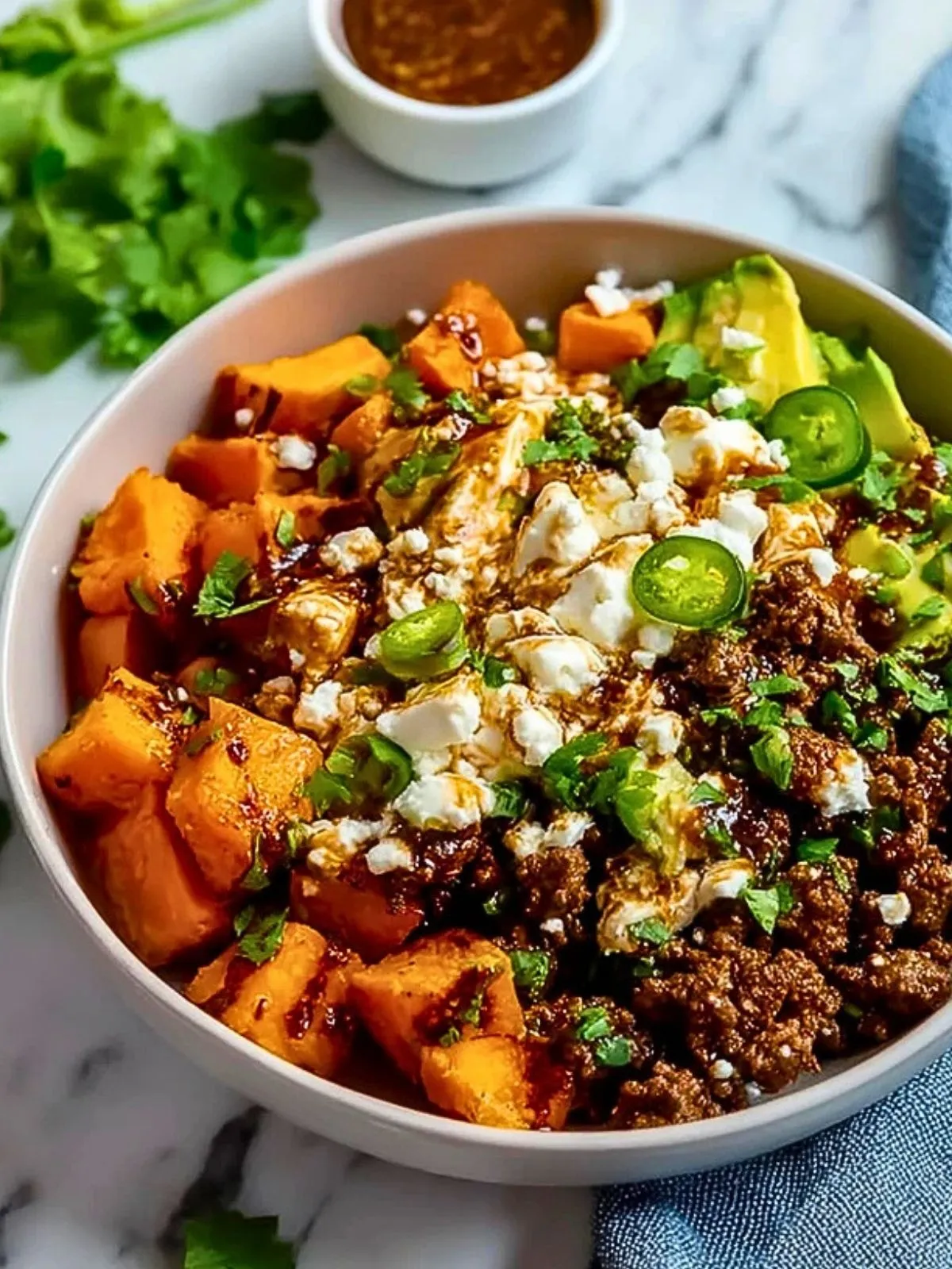 Ces bols de viande hachée, patate douce et fromage cottage constituent un repas complet, rassasiant et riche en protéines, parfait après une séance de sport ou pour un déjeuner équilibré.