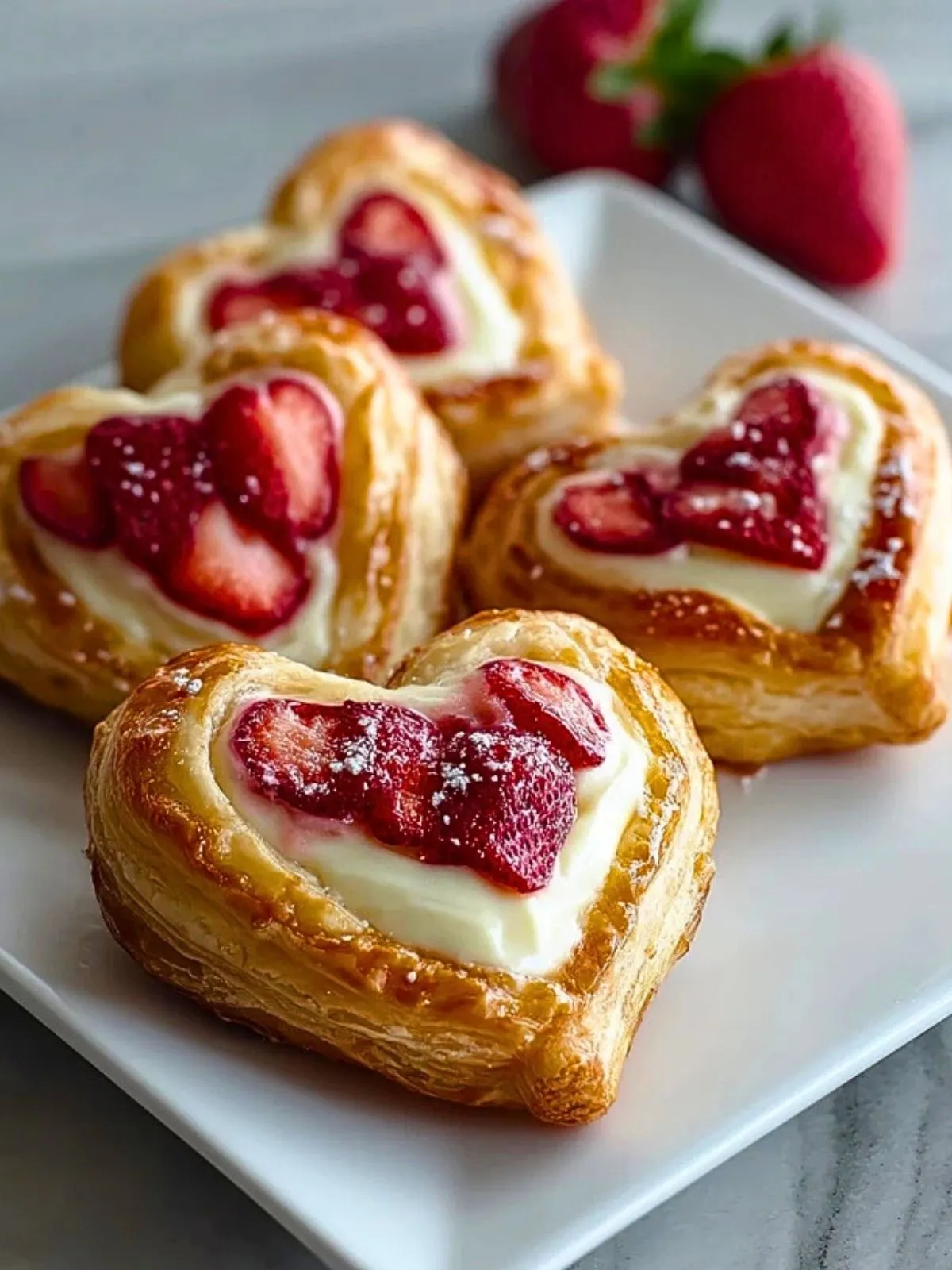 Keywords: danishes aux fraises, fromage à la crème, cœur feuilleté, dessert romantique, viennoiserie aux fraises, pâte feuilletée, brunch sucré