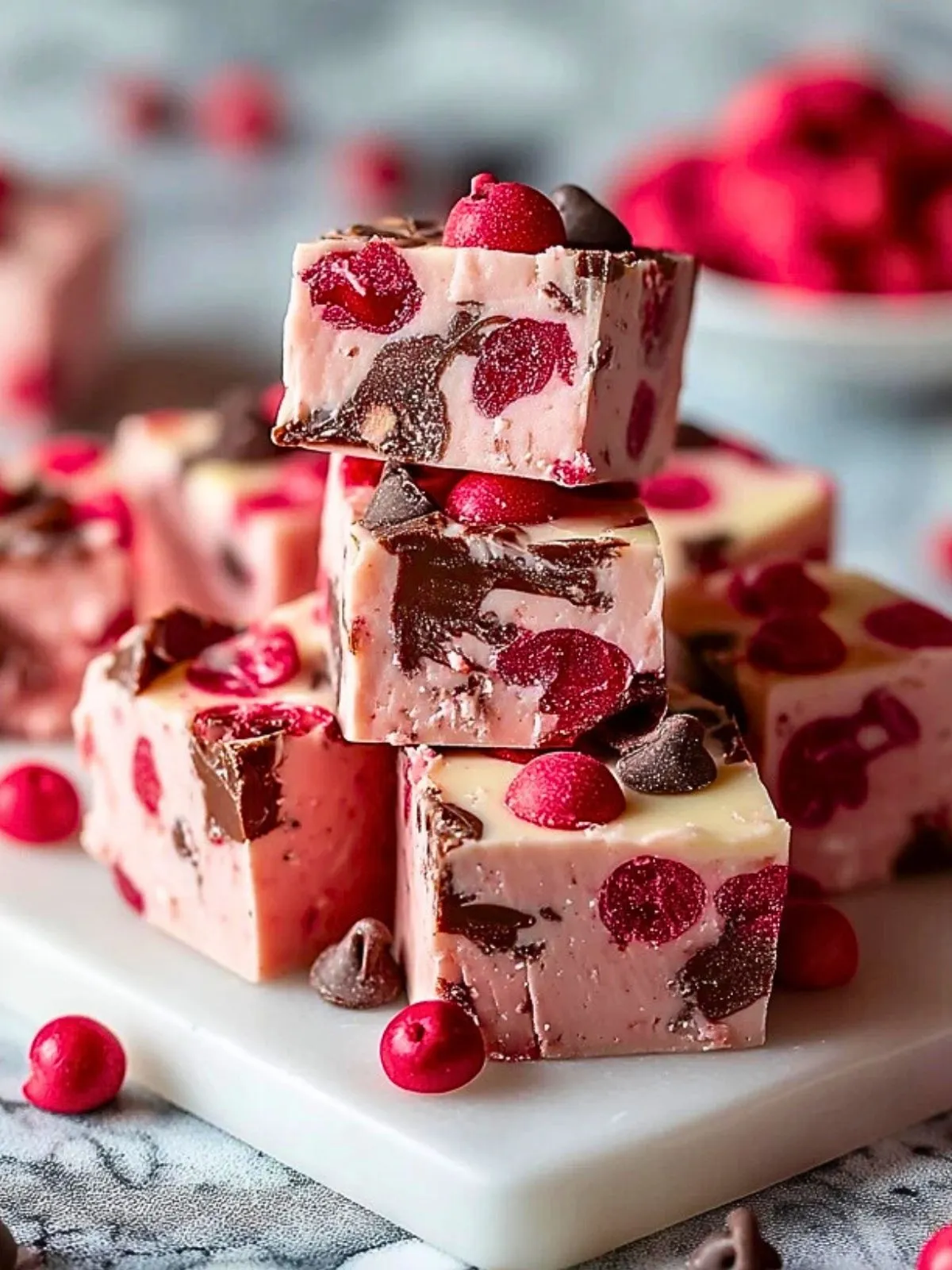Ce fudge aux cerises irrésistible marie la douceur du chocolat blanc, l’acidité des cerises et le croquant du chocolat noir pour créer de petits cubes ultra gourmands. Rapide à préparer, sans thermomètre ni technique compliquée, il se prépare à l’avance et se découpe en bouchées parfaites pour les fêtes, les cadeaux gourmands ou le café gourmand.