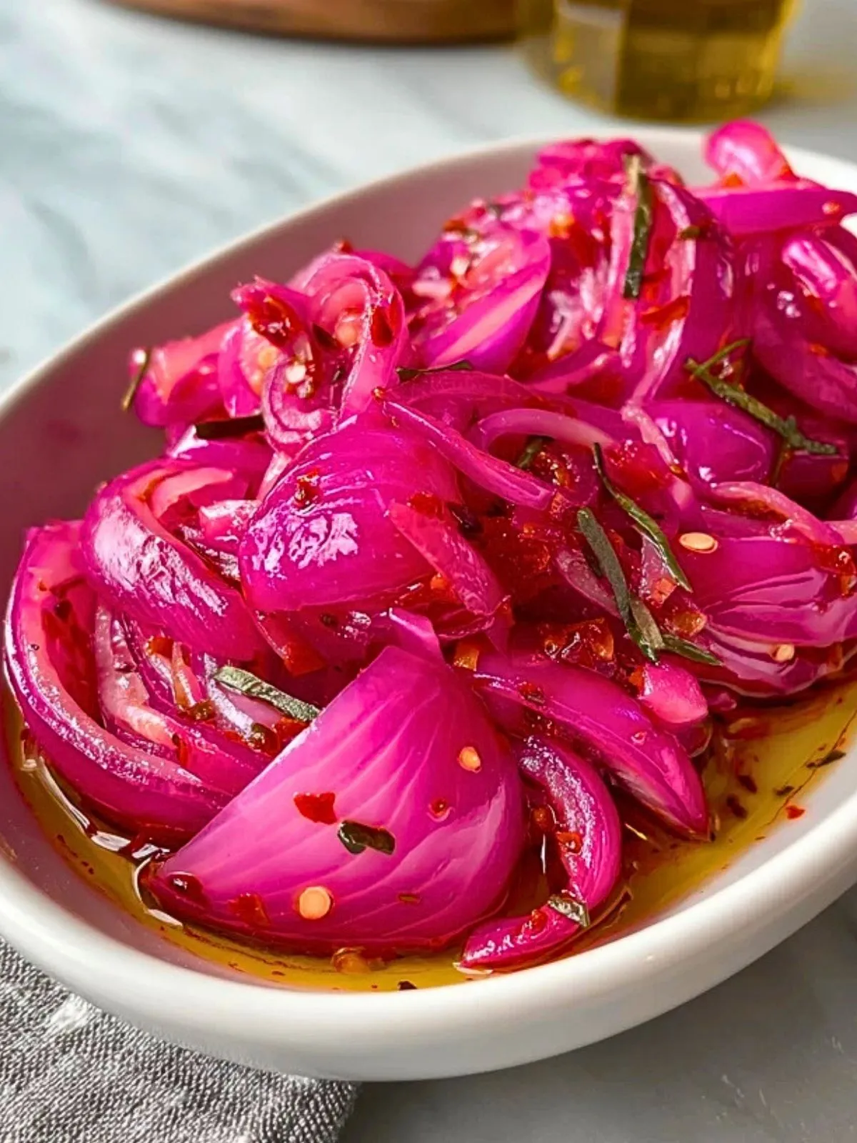 Ce que j’aime le plus dans cette recette, c’est son équilibre. Le miel adoucit naturellement la puissance du vinaigre, tandis que le piment relève l’ensemble sans masquer la fraîcheur de l’oignon rouge. En quelques gestes seulement, j’obtiens un condiment maison plein de caractère, pratique à conserver et toujours prêt à réveiller mes assiettes.