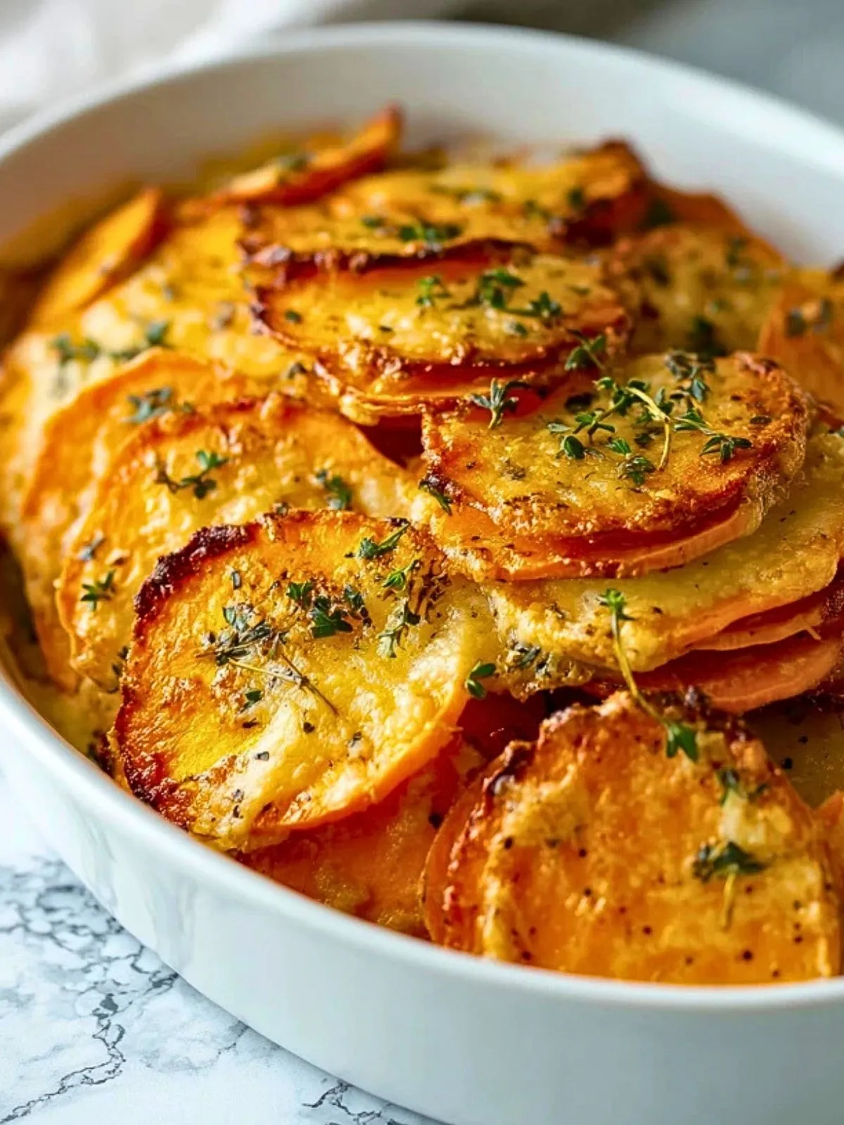 Gratin crémeux de patates douces parfumé à l’ail, fondant et savoureux, parfait en accompagnement ou en plat végétarien réconfortant, avec une belle croûte dorée au parmesan.