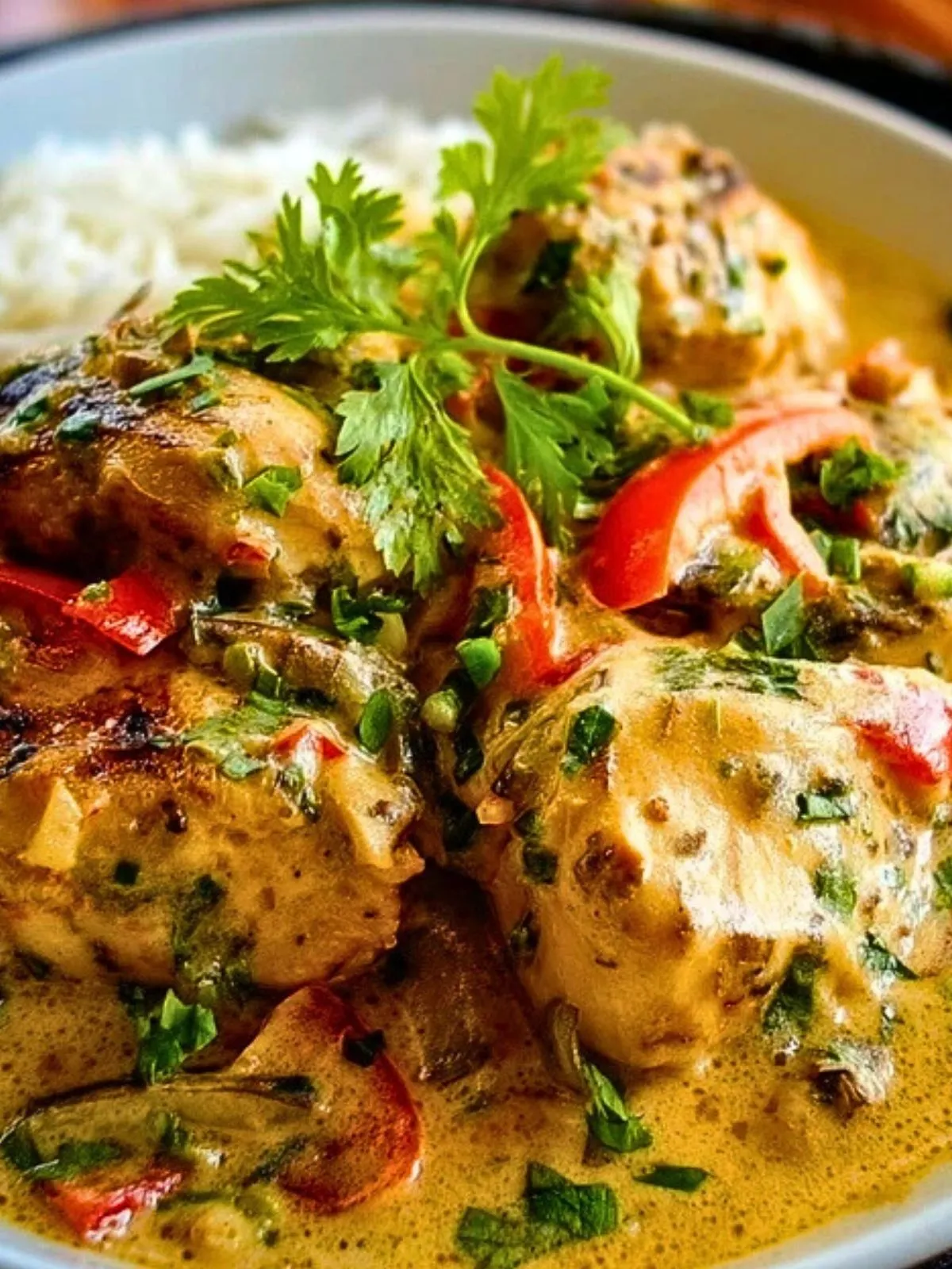 Un délicieux plat de Poulet Crémeux au Lait de Coco, parfumé au curry et gingembre, simple à préparer pour un repas réconfortant et exotique.