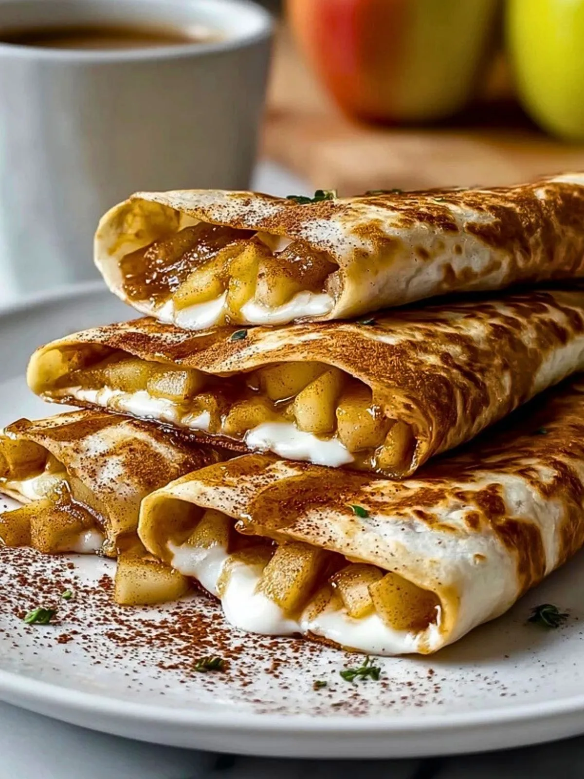 3. Étaler le fromage frais sur une moitié de chaque tortilla, ajouter les pommes cuites et un filet de sirop d’érable si souhaité.
