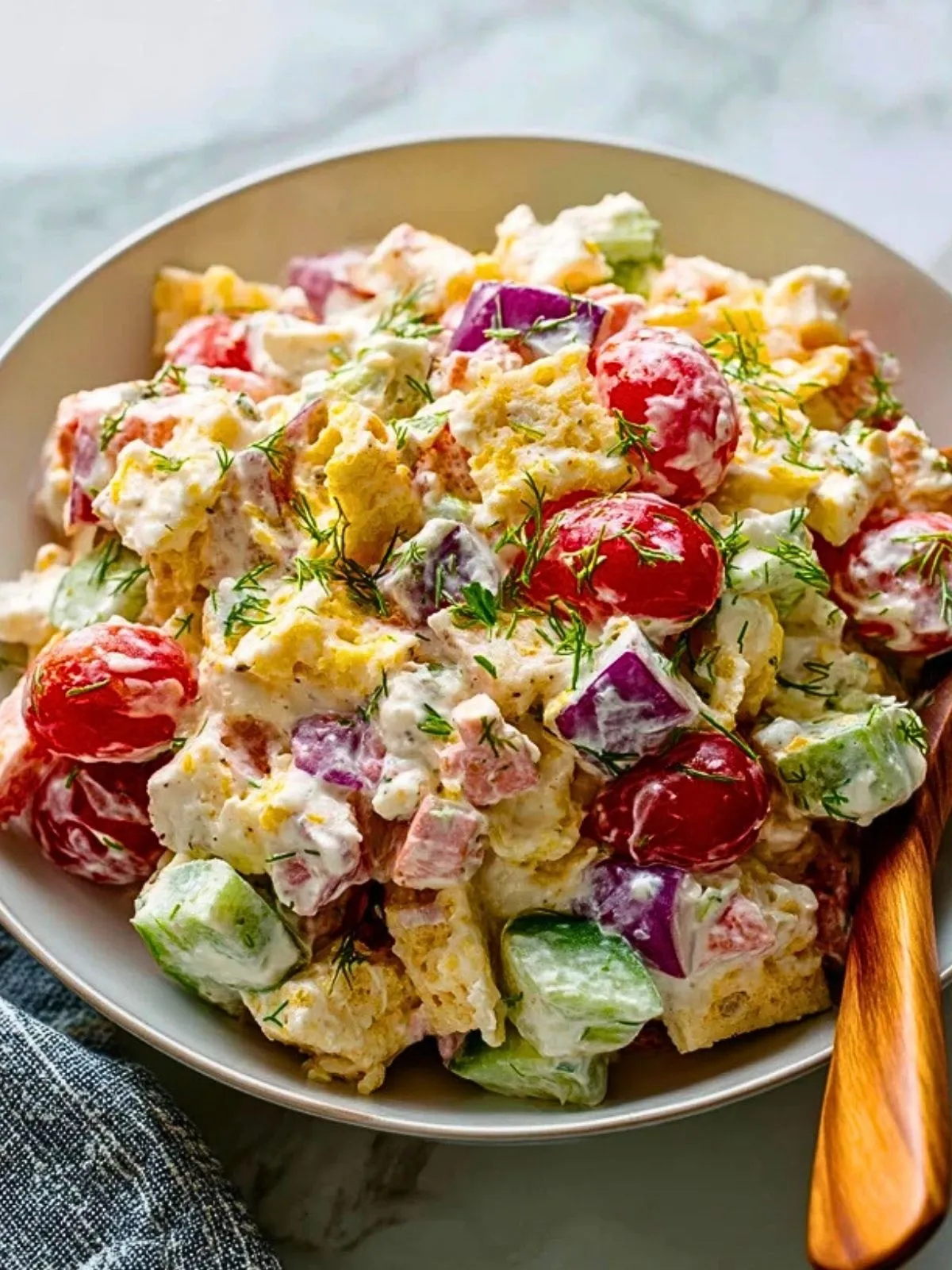 La salade de craquelins de Géorgie est une recette froide, crémeuse et conviviale, parfaite pour un déjeuner d’été, un buffet ou un accompagnement original. Avec ses légumes croquants, ses œufs durs, sa sauce onctueuse et ses craquelins salés, cette salade facile et rapide à préparer offre un mélange savoureux de fraîcheur, de fondant et de texture.