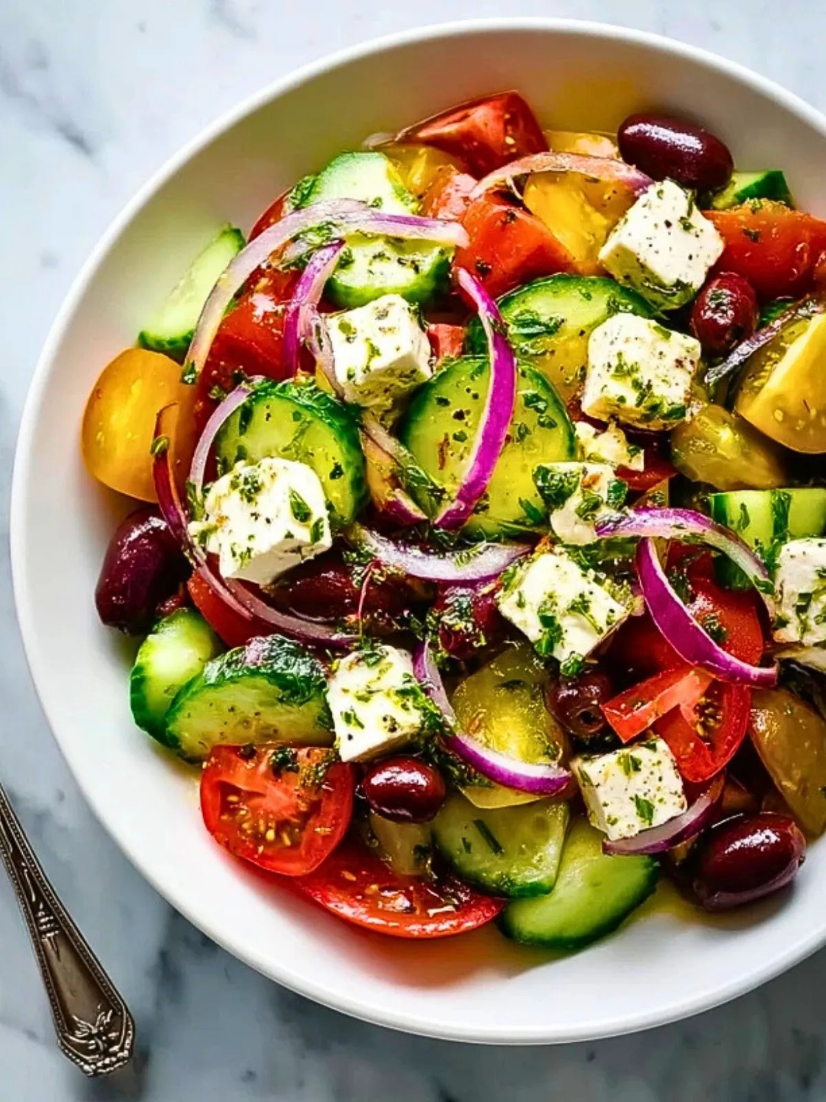 Keywords: salade grecque, salade méditerranéenne, feta, concombre, tomates, olives