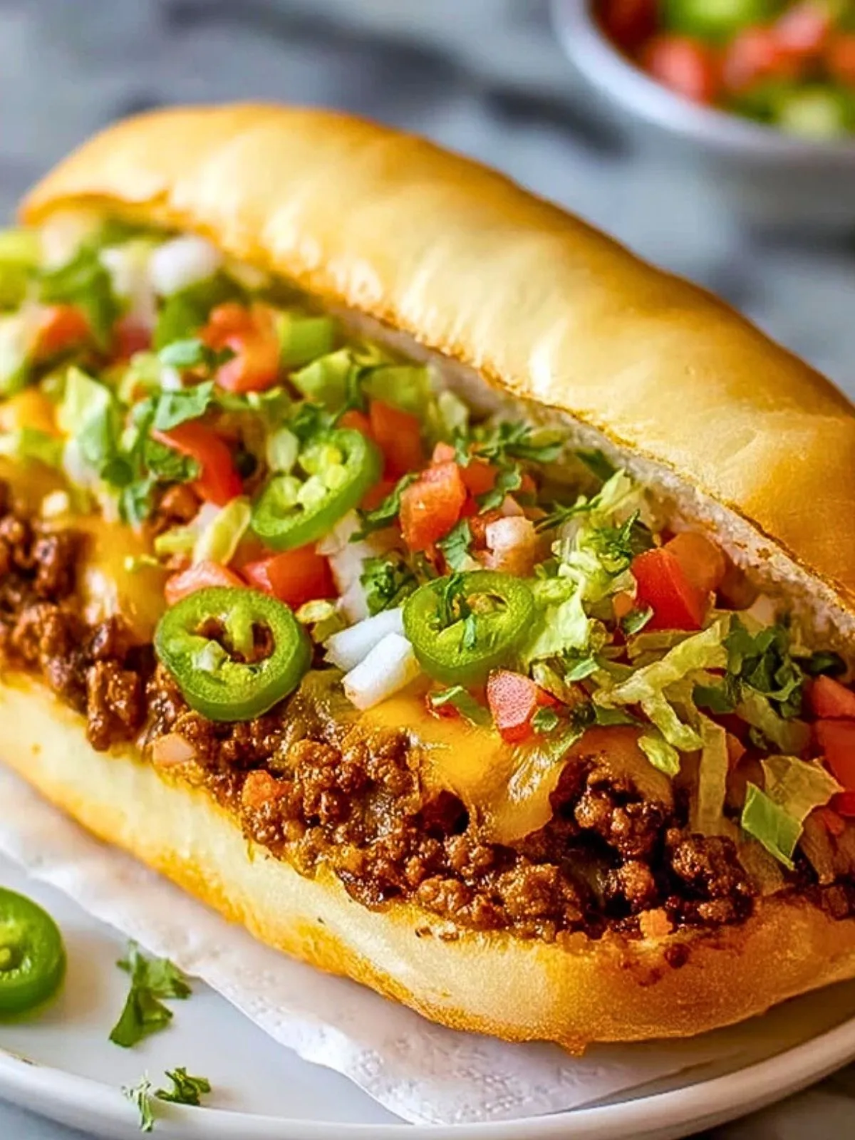 Ce sandwich mexicain à la viande hachée est garni d’un bœuf juteux aux épices tex-mex, d’un duo de fromages fondants et d’une salsa fraîche à la coriandre. Parfait pour un dîner rapide en semaine, il rappelle les saveurs des tacos dans un pain croustillant, idéal pour régaler toute la famille sans passer des heures en cuisine.