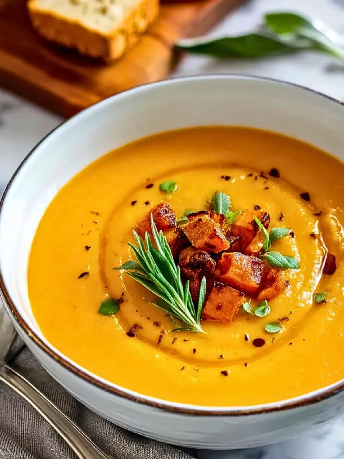 9. Sers la soupe bien chaude dans des bols, garnis de cubes de patate douce rôtie réservés, de feuilles de sauge ou basilic, d’un filet de balsamique et éventuellement de croûtons ou de pain grillé.