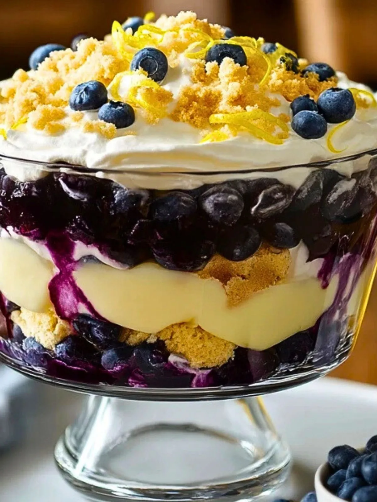 Placez au frais pendant au moins 4 heures (idéalement toute une nuit). Décorez de quelques myrtilles fraîches et zestes de citron juste avant de servir.