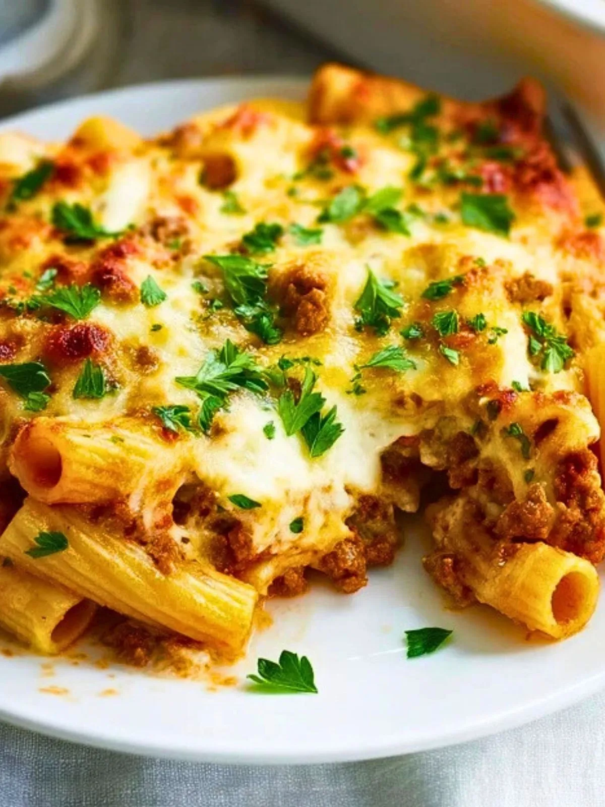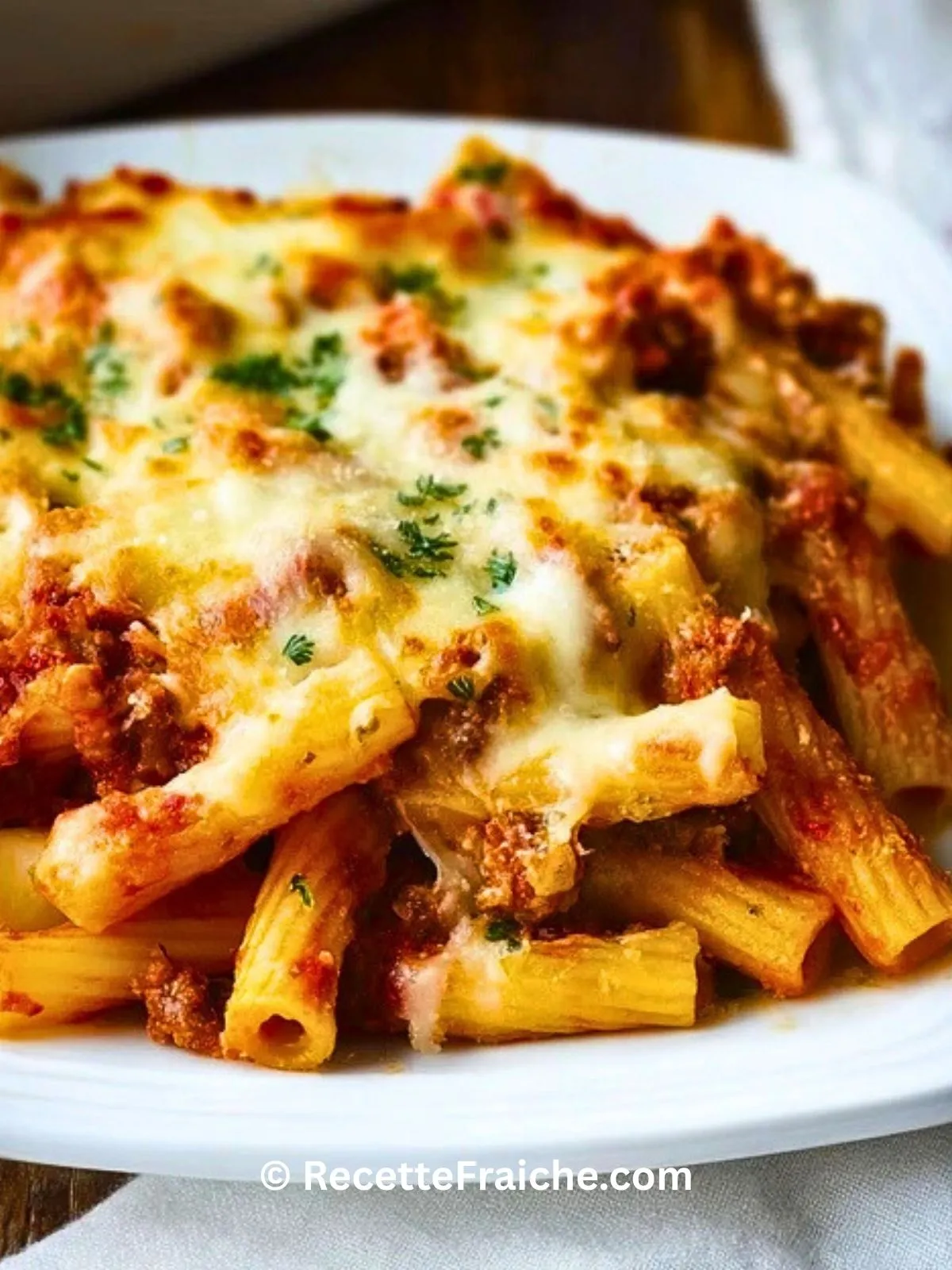 Gratin de ziti au four sans viande, crémeux et ultra gourmand, garni de ricotta, mozzarella, parmesan et sauce tomate. Un plat végétarien familial, simple, réconfortant et parfait pour régaler petits et grands en toute occasion.